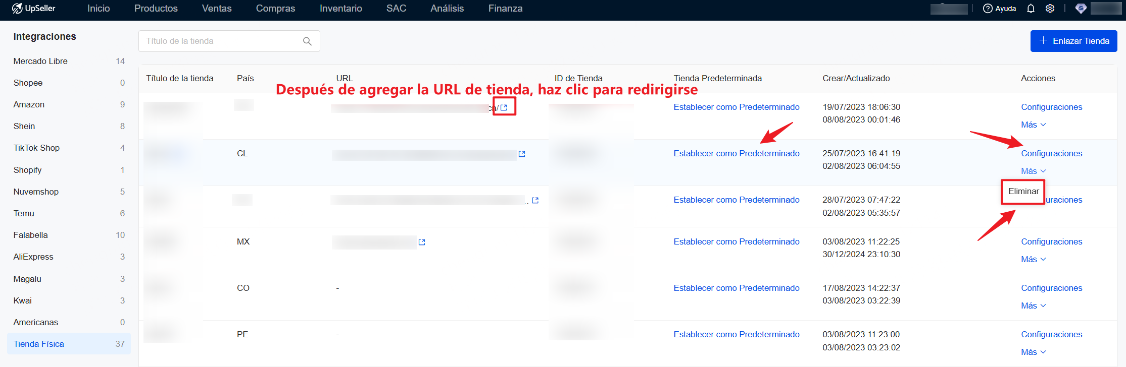 3. Podrás ver datos de la tienda enlazada en la página Integraciones. Se permite establecer una tienda predeterminada, editar/eliminar la tienda