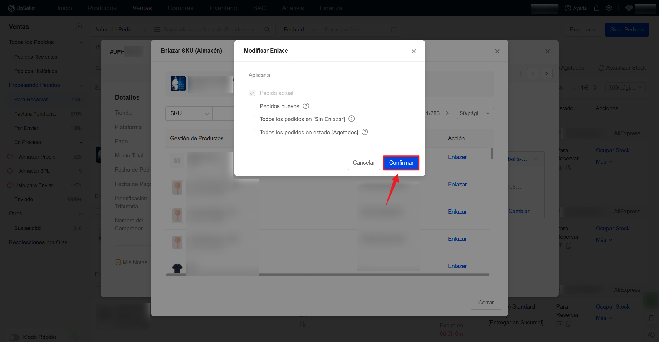3. Haz clic en Remover para desenlazar la relación enlazada. Haz clic en "Enlazar SKU de las Publicaciones" para añadir el enlace de SKU