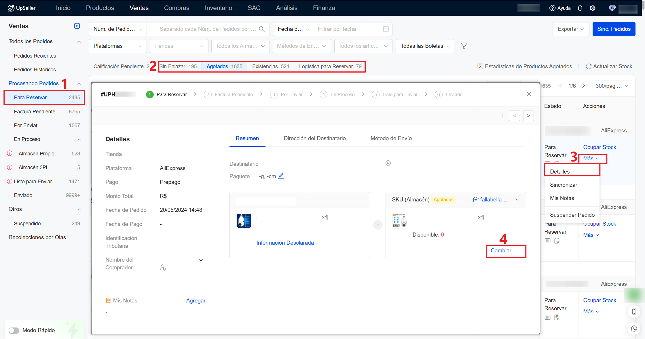 1.Para pedidos en la sección Para Reservar con estados: Sin Enlazar, Agotados, Existencias y Logística para Reservar, haz clic en Más>>Detalles para cambiar la relación enlazada y elige el rango de aplicación