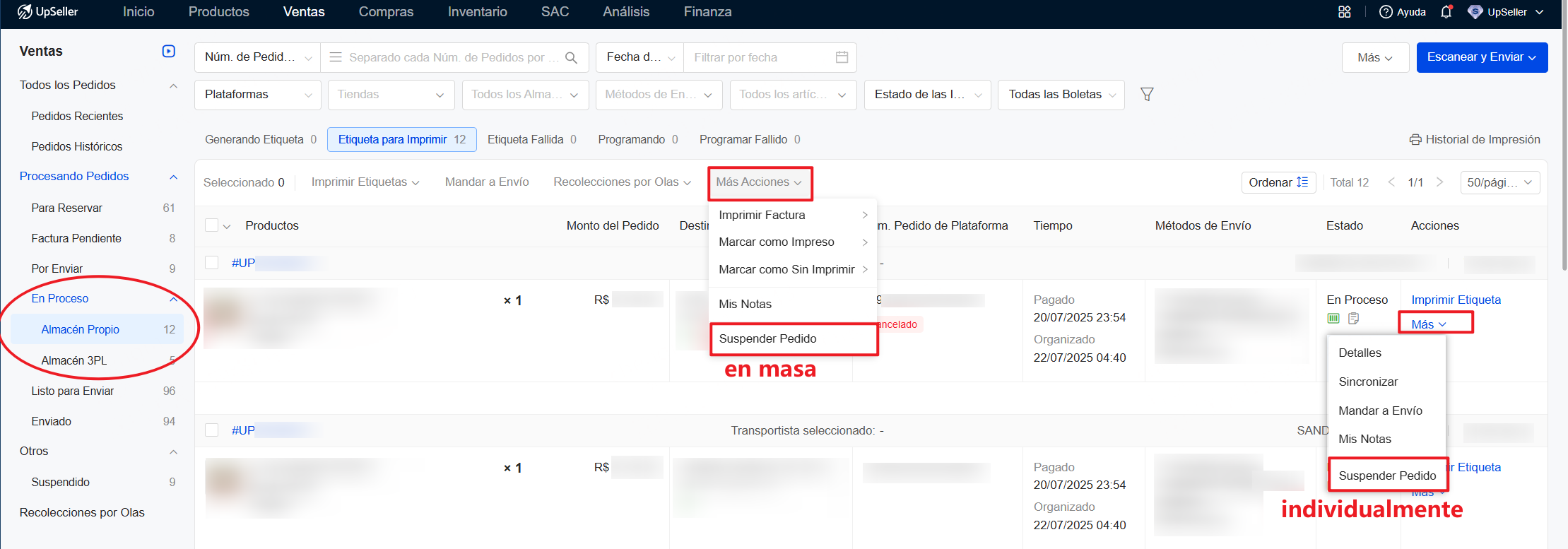 Situación 3: Cuando el pedido está en la sección En Proceso, haz clic en Más>> Suspender Pedido. El pedido se moverá a la sección Suspendido y podrás cambiar el almacén de forma individual o masiva. Una vez realizado el cambio con éxito, haz clic en Revertir Pedido para recuperar el estado del pedido