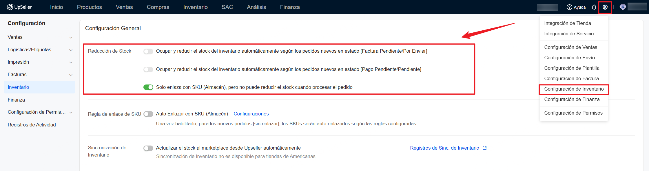 La configuración de inventario no ha habilitado la deducción de stock ni la opción solo enlaza con SKU(Almacén)