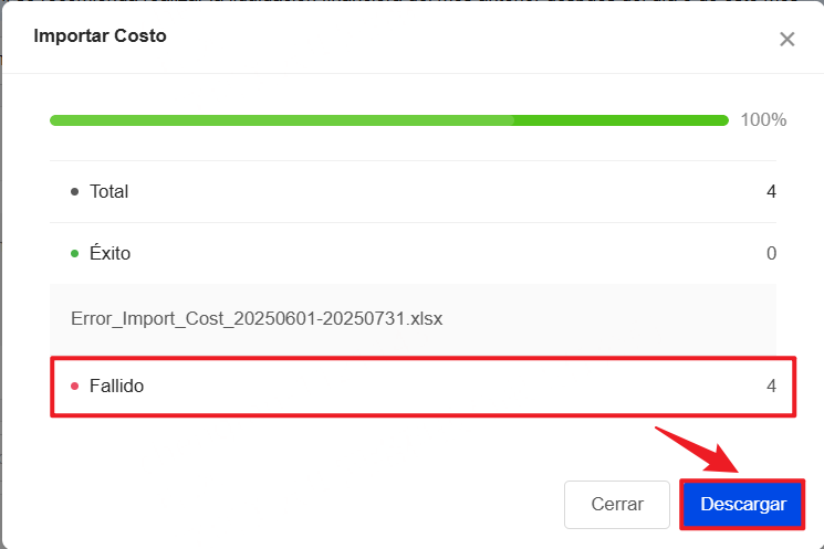1. Importar Costo solo está disponible para productos de pedidos sin enlazar. Si el pedido ya está enlazado, pero no tiene costo, ingresa el costo y realiza una recalculación de costo.