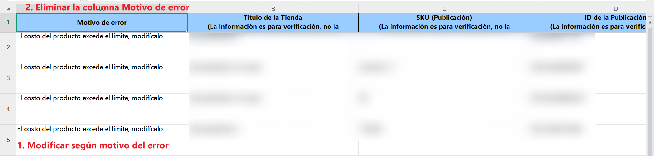 A1: Haz clic en Descargar >> Modifica según motivo del error >> Elimina la columna Motivo de error en el archivo excel, guarda el archivo >> Vuelve a cargar el archivo