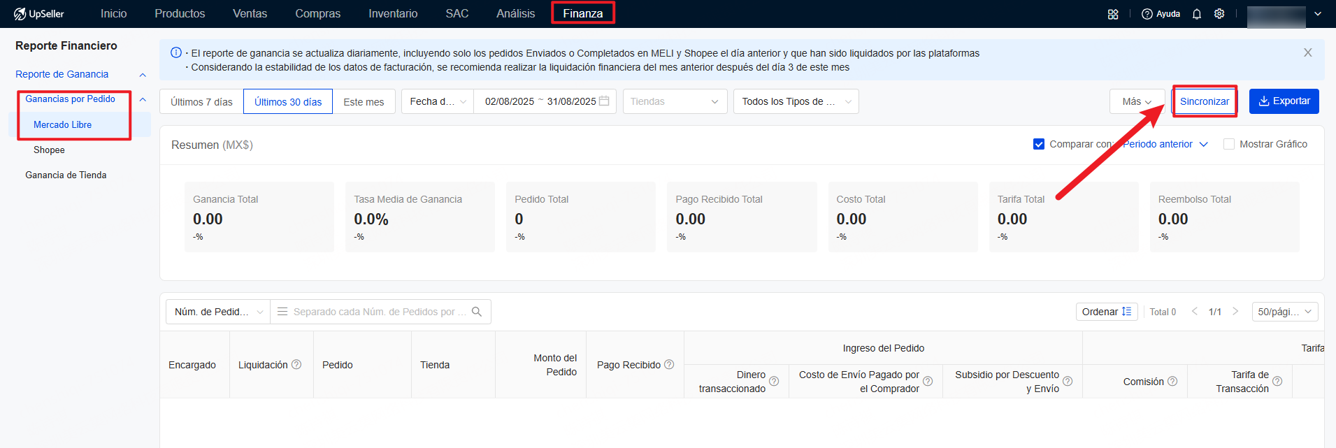 [Finanza] Permite sincronizar manualmente la última facturación de tienda en MELI y calcular la ganancia en Reporte de Ganancia