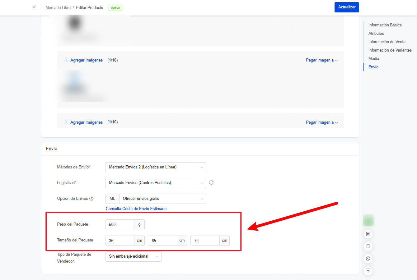 [Productos] Permite editar información de peso y dimensiones del paquete para publicaciones activas de MELI