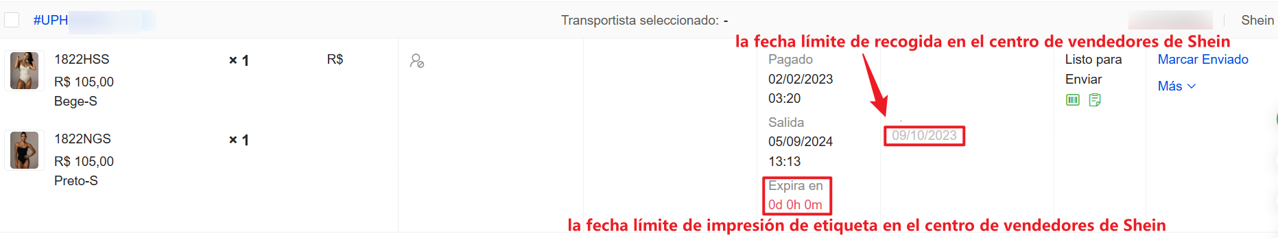 La fecha límite para enviar en UpSeller corresponde a la fecha límite de impresión de etiqueta en el centro de vendedores de Shein