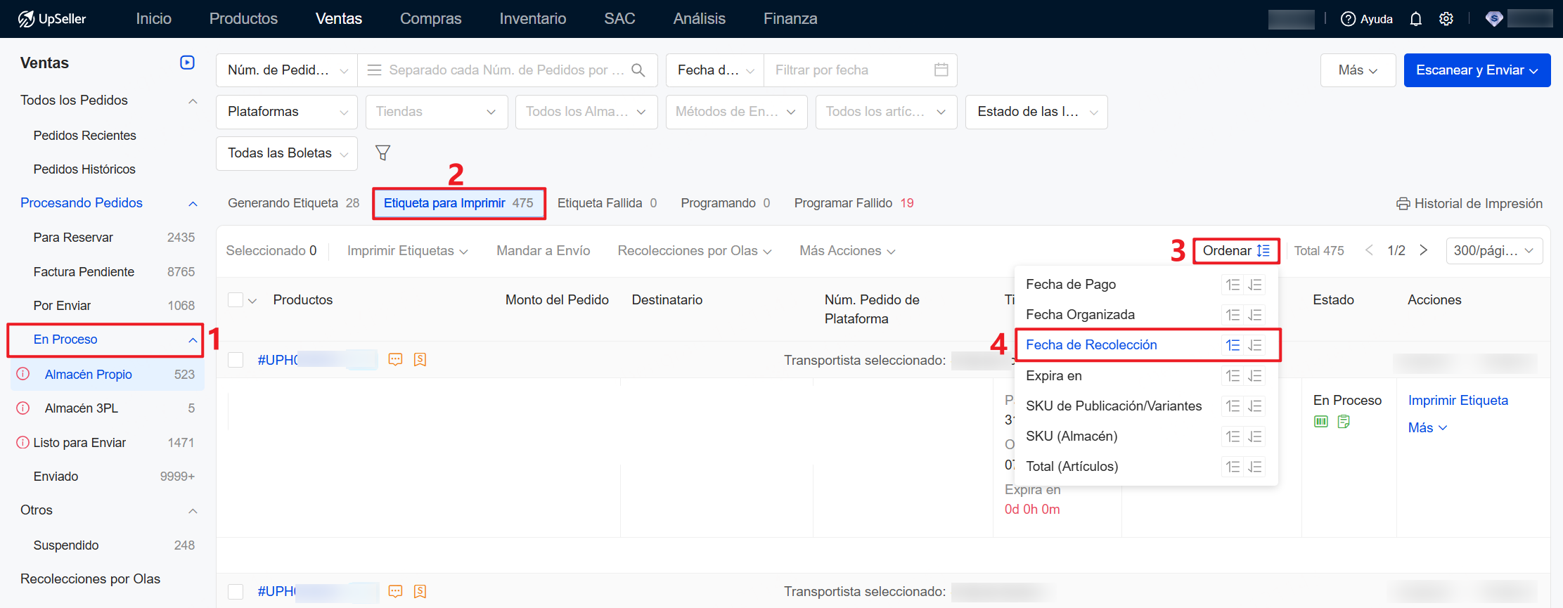 Nota: Además, se admite filtrar e imprimir etiquetas de los pedidos según fecha de recolección (como se muestra en la imagen)