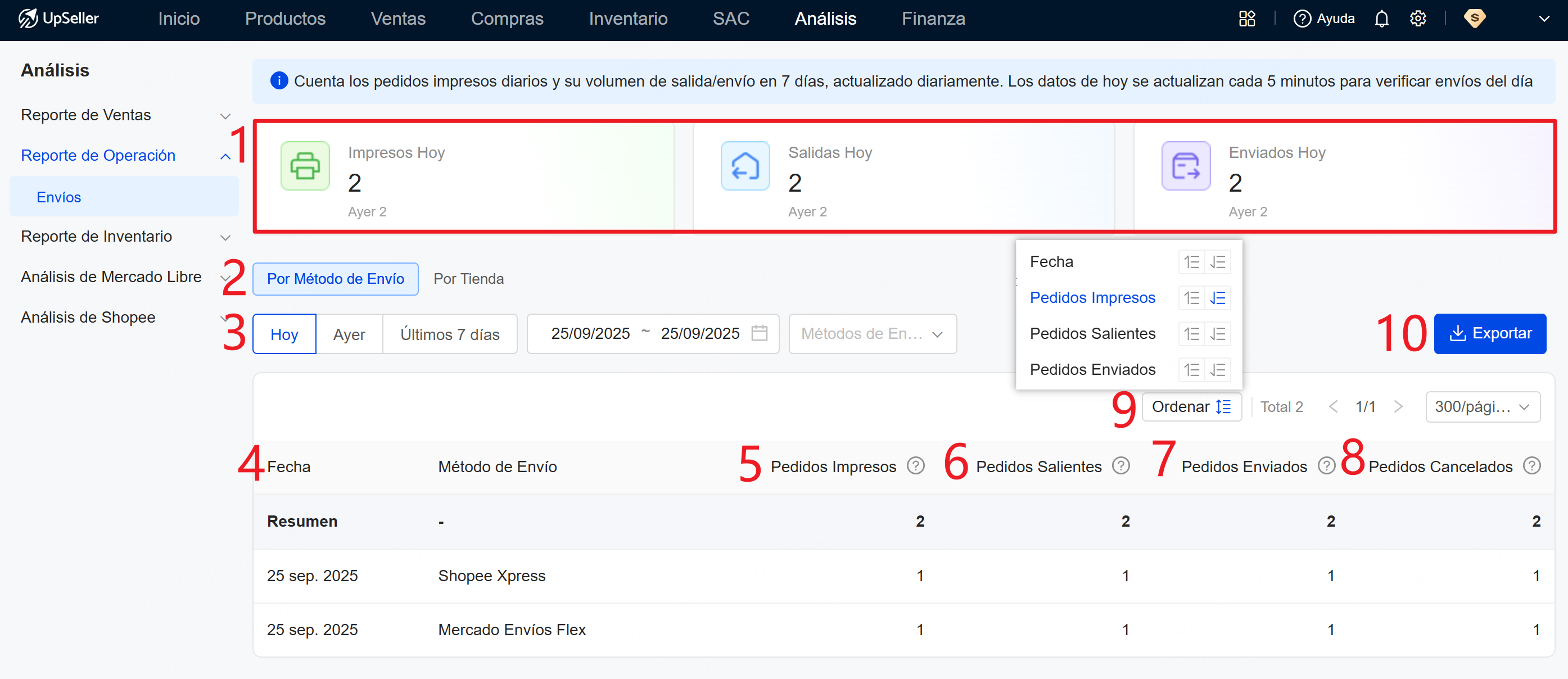 Permite contabilizar la cantidad de envíos diarios, conocer el número de pedidos impresos (incluye los marcados como impresos en almacén propio o empujados correctamente al almacén 3PL), así como los pedidos salientes y enviados, evitando la omisión de pedidos.