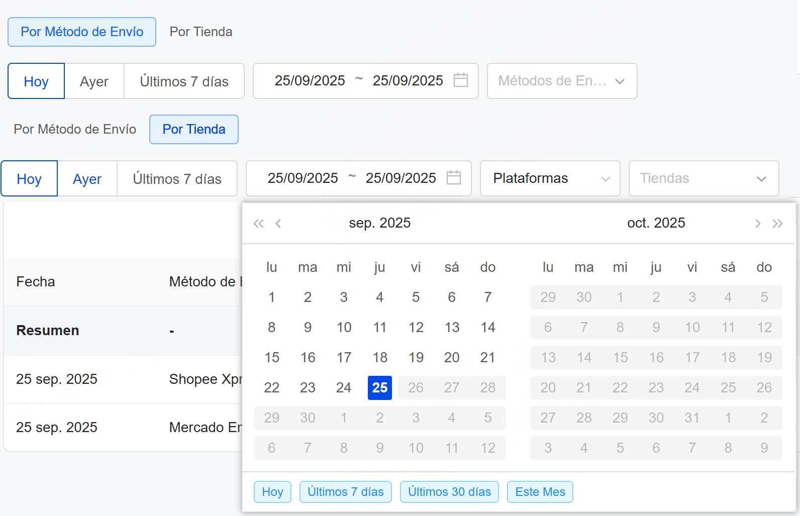 2. Permite ver los datos Por Método de Envío o Por Tienda
