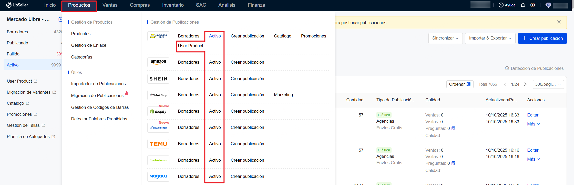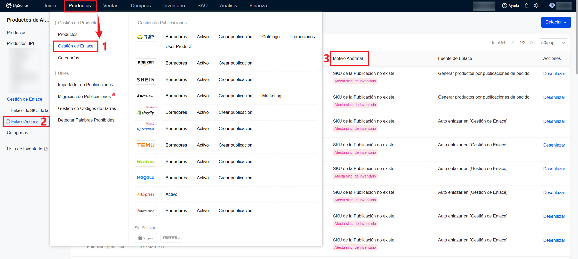 Ve a Productos >> Gestión de Enlace >> Enlace Anormal >> Ver las soluciones correspondientes por motivo anormal de enlace anormal, conoce más >> https://help.upseller.com/es/doc-article/1499