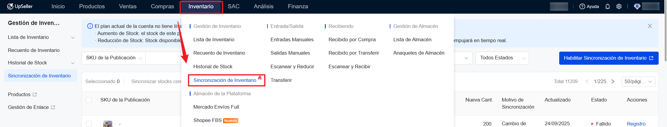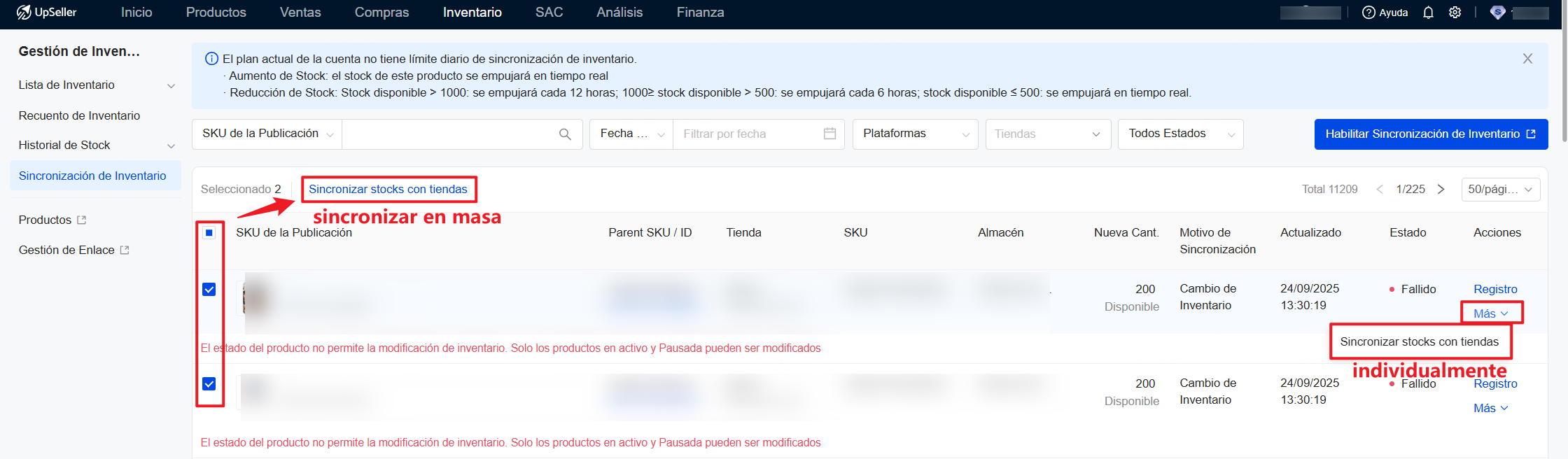2. Si el estado de publicación es activo o pausado, ve a Inventario >> Sincronización de Inventario >> encuentra el registro de inventario correspondiente y haz clic en Más >> haz clic en Sincronizar stocks con tiendas para volver a intentarlo
