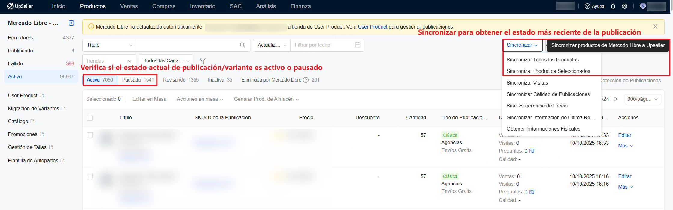 Solo las publicaciones en estado activo y pausado admiten la sincronización de inventario. Si la publicación no se encuentra en ninguno de estos estados, la actualización de inventario fallará