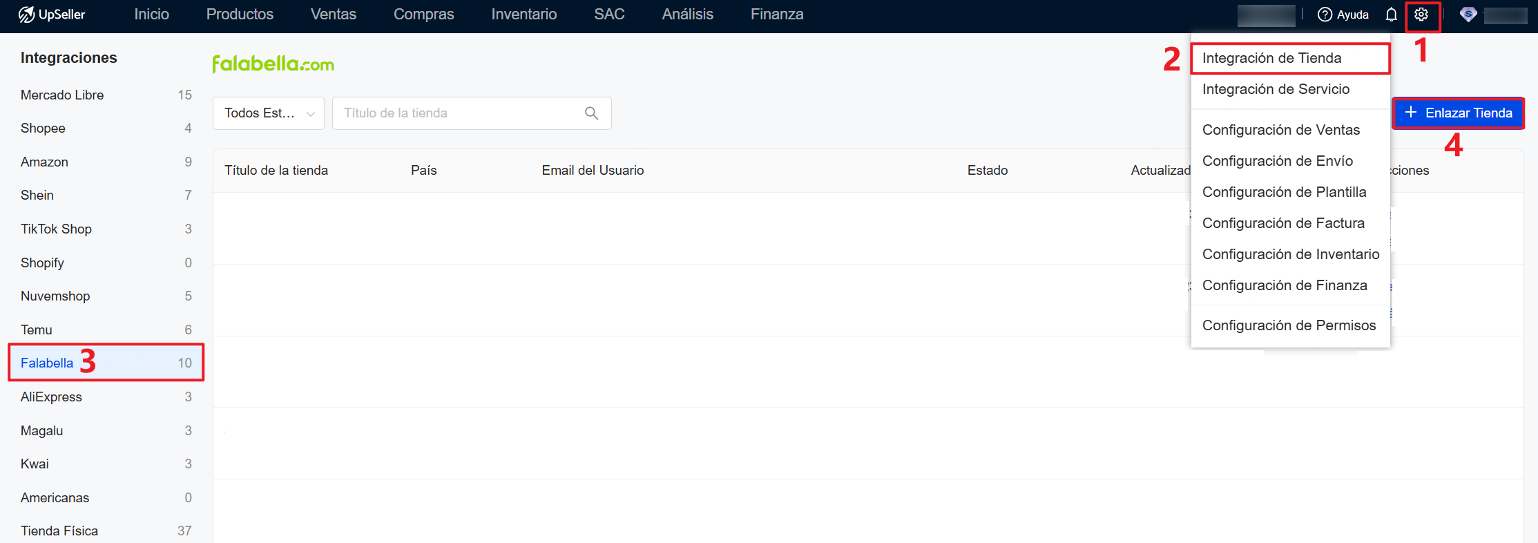Entrada: Configuraciones >> Integración de Tienda >> Elige Falabella >> Haz clic en Enlazar Tienda