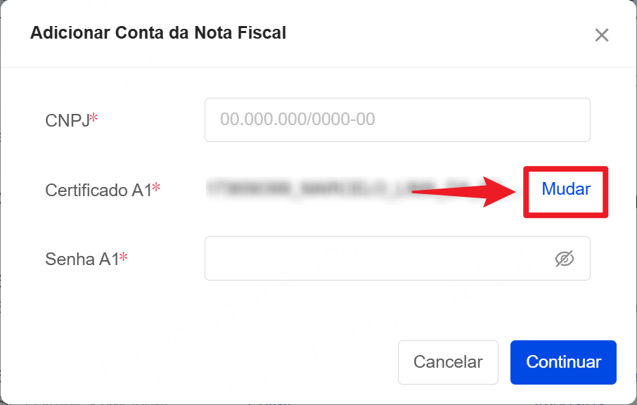 Clique em "Mudar" e suba novamente um Certificado A1 registrado com o CNPJ da empresa.