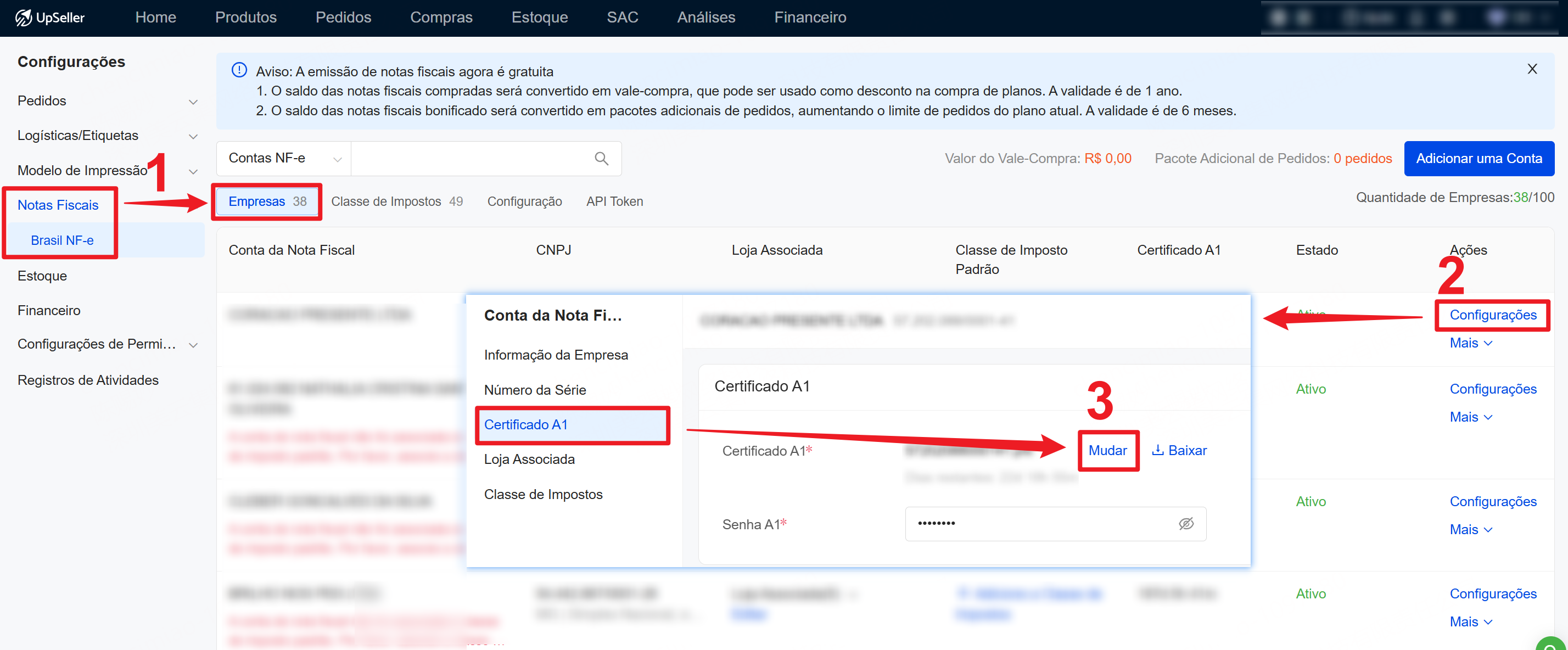 Entrada 2(Já existe conta NF-e): Configurações da Nota Fiscal >> Empresas >> Configurações >> Certificado A1 >> Mudar