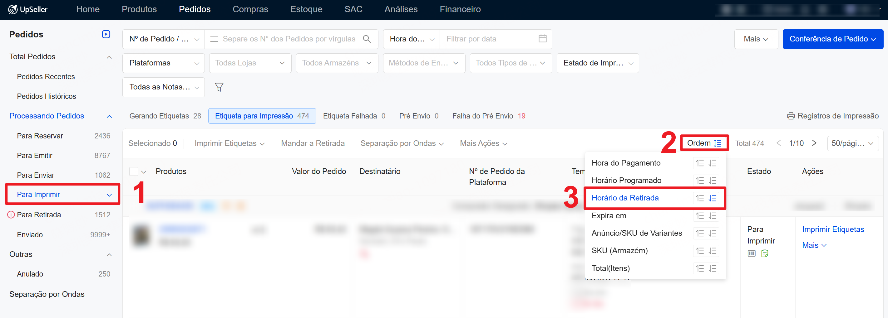 OBS: Também é possível filtrar e imprimir etiquetas dos pedidos pelo ordem de Horário da Retirada.