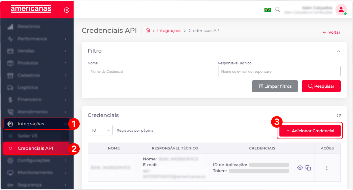 Passo 1: Acesse o painel da Americanas Marketplace >> Clique em Integrações >> Credenciais API >> Adicionar Credencial