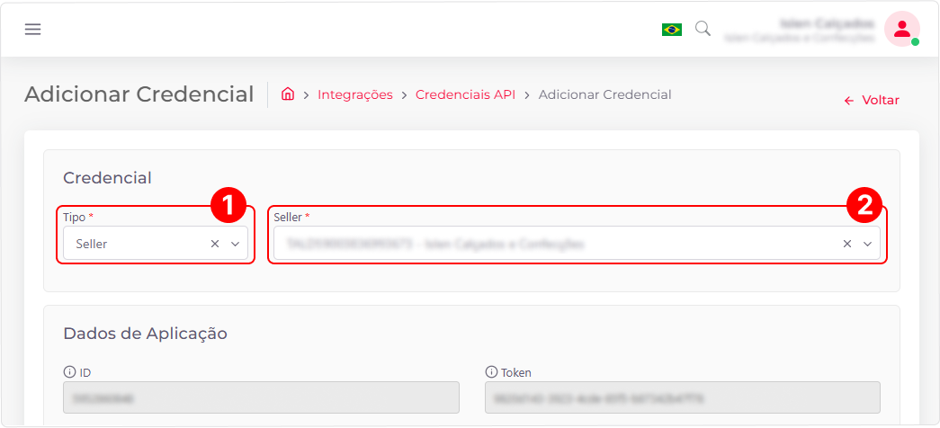 Passo 2: Na seção Credencial >> Selecione Tipo e Seller