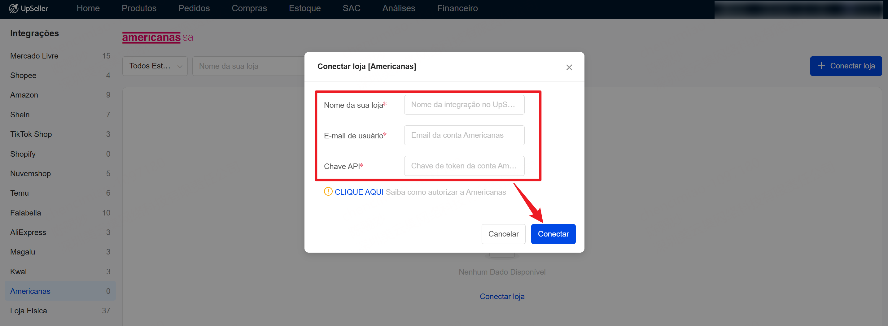 Passo 3: Digite o nome da loja >> Digite o e-mail (O e-mail é o mesmo que você registrou a conta em Americanas Marketplace) >> Digite a chave da API (obter token na Americanas Marketplace) >> Clique "Conectar", você entrará na página de autorização da Americanas(B2W)