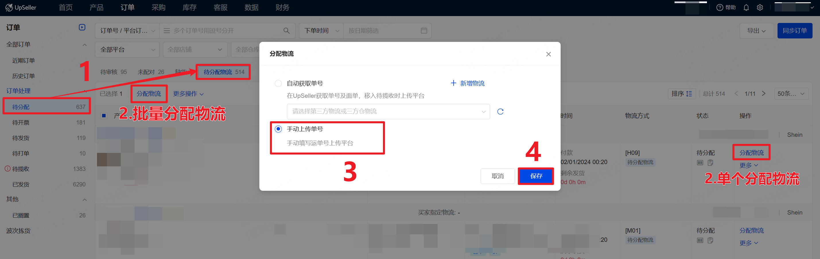 第一步:进入【待分配】列表>>待分配物流,点击“分配物流”>>选择“手动上传单号”