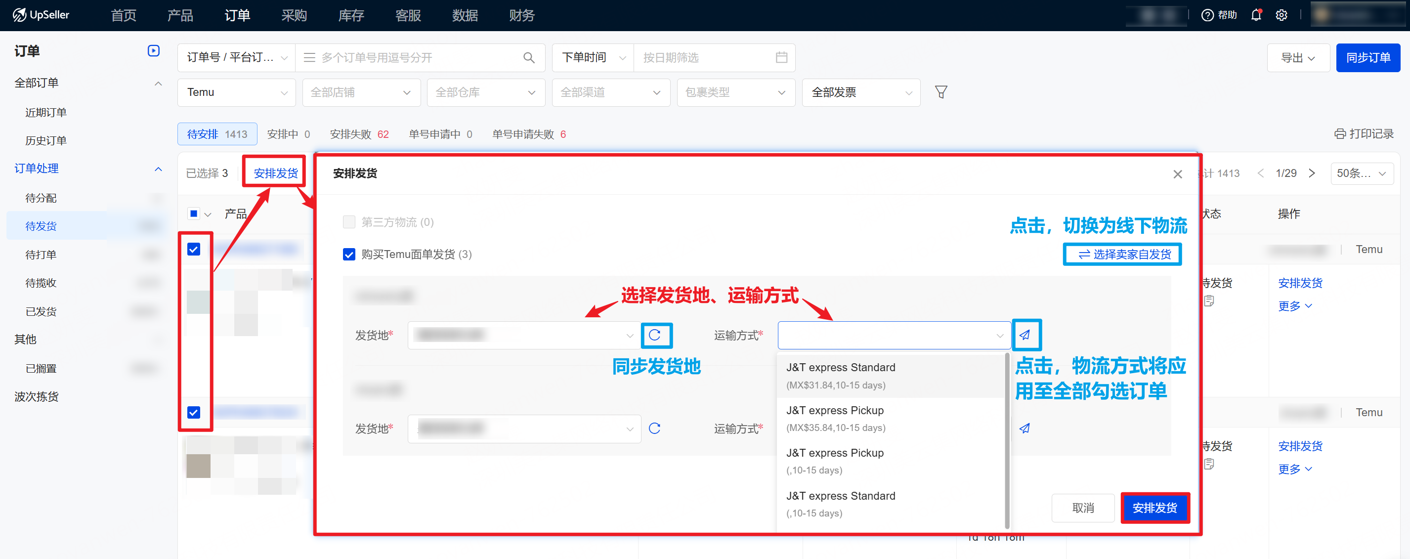 进入【待发货】>>待安排列表>>勾选订单,点击“批量安排”>>按店铺选择发货地、运输方式>>点击“安排发货”