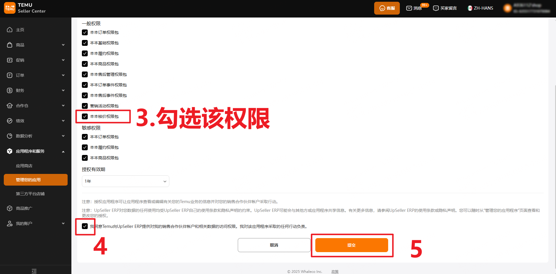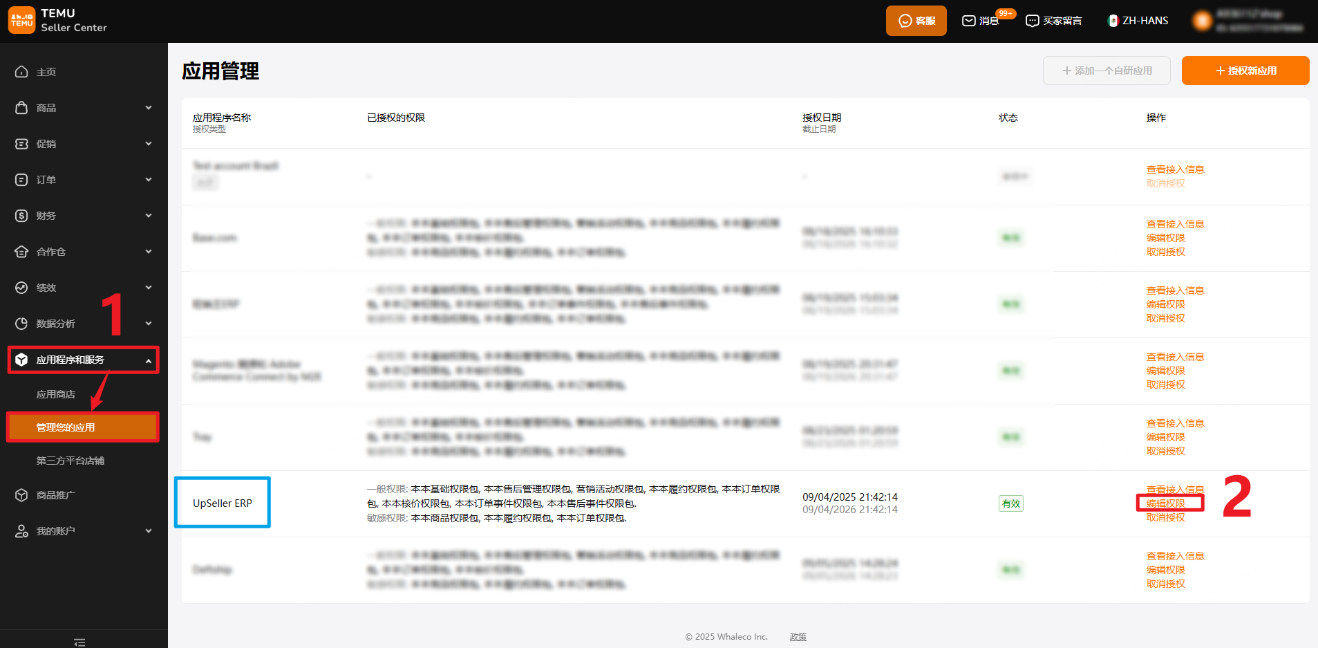 一、定义 在 Temu 卖家中心给 UpSeller ERP 授权后,即可查询产品供货价 二、操作步骤 第一步:进入Temu卖家中心,点击“应用程序和服务”>>点击"管理您的应用">>找到UpSeller ERP,点击“编辑权限” 第二步:勾选“本本核价权限包”>>勾选“同意访问权限”>>点击“提交” 三、常见问题 Q1:已授权但不显示供货价怎么办? A1:进入 Temu 在线产品页面,点击单个或批量 "同步" ,更新产品数据即可