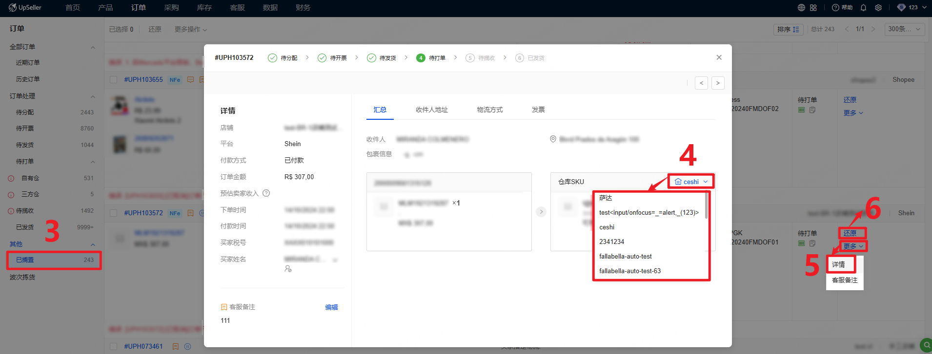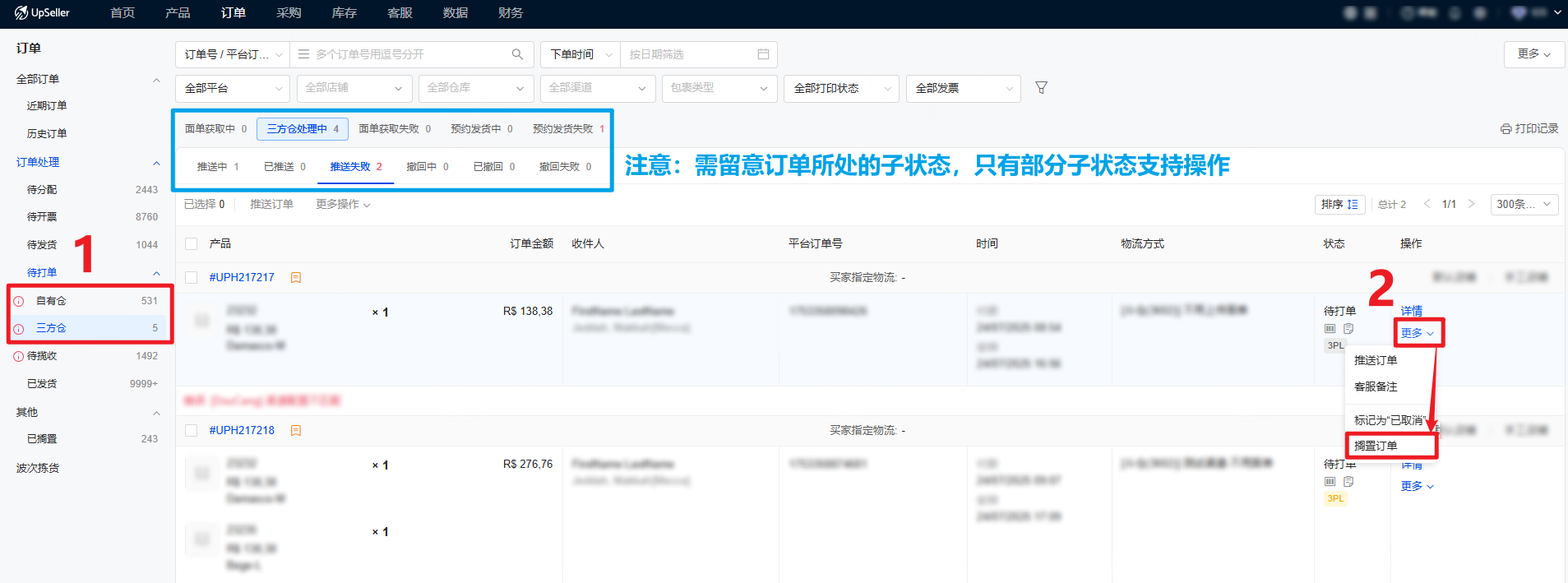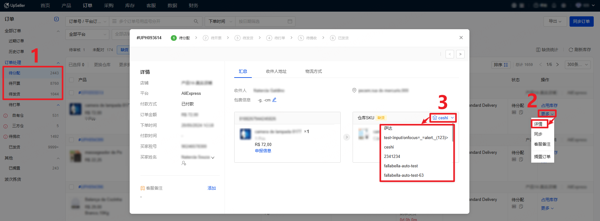 情况1:当订单处于“待分配”/“待开票”/“待发货”状态时 操作步骤:点击“更多-详情”,即可切换仓库 情况2:当订单处于“待打单”状态时 操作步骤:点击“更多-搁置订单”>>再进入“已搁置”状态>>点击“更多-详情”,切换仓库>>点击“还原”,将订单还原至“待打单”状态,继续处理 情况3:当订单处于“待揽收”或“已发货”状态时,不支持更换仓库。