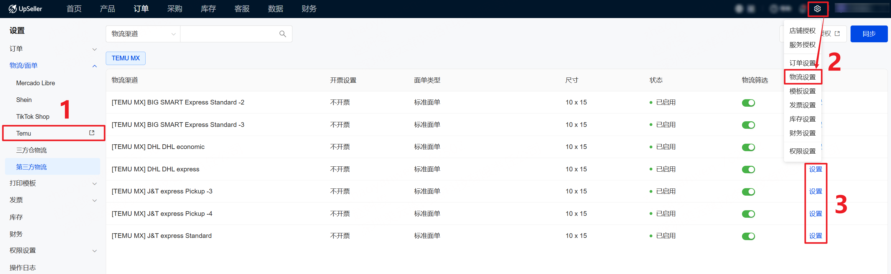 1.点击“设置” >>Temu>>跳转到Temu物流渠道页面>>点击单个物流旁的“设置”