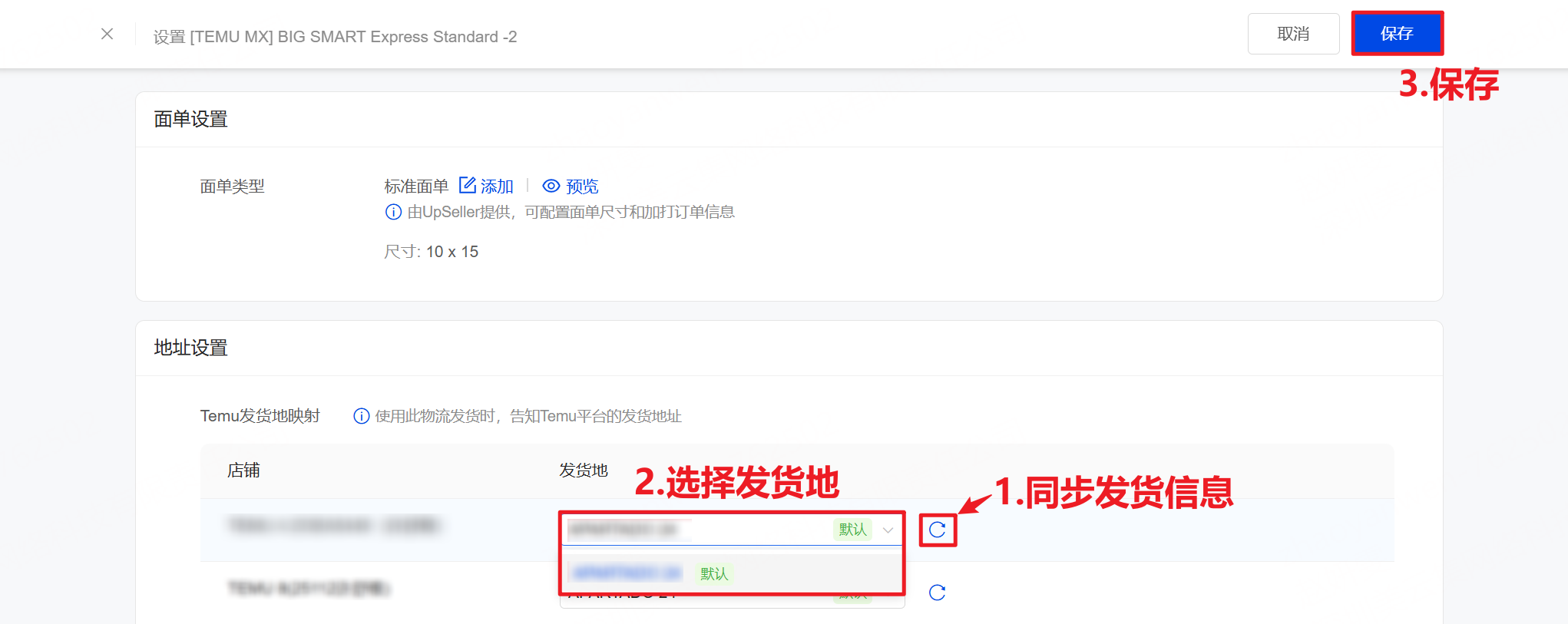 2.进入物流设置页,可为Temu物流设置自定义面单和发货地映射。设置完后,点击右上角“保存”