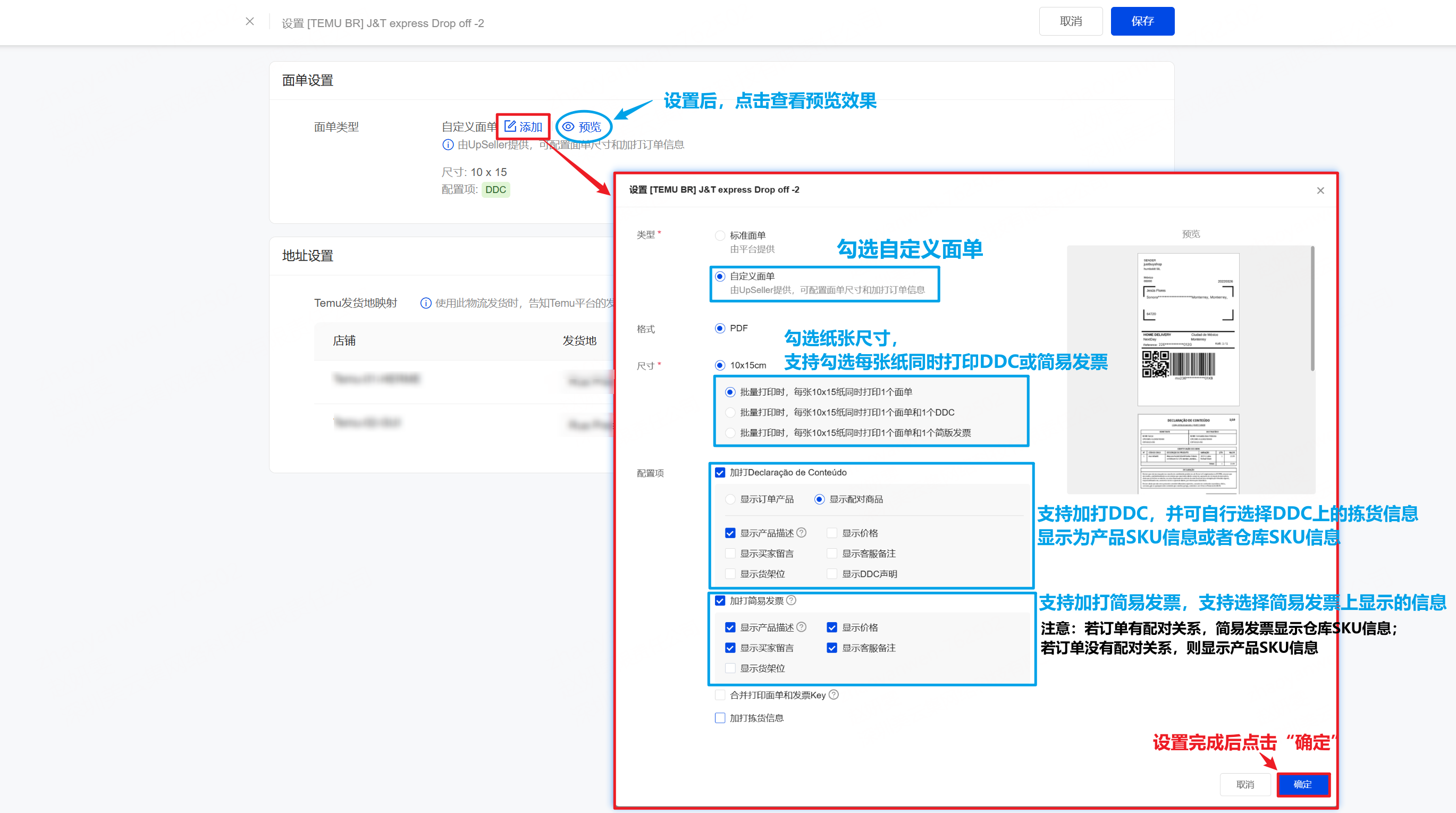 UpSeller 自定义面单在平台标准面单基础上优化,支持 10x15cm/10x20cm 尺寸选择,对于巴西站点,支持加打简易发票或者DDC,还能自由选择加打产品标题、变种、订单备注等其他拣货信息,提升拣货效率