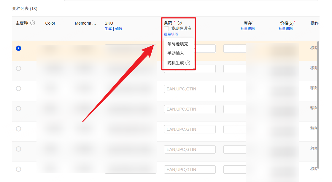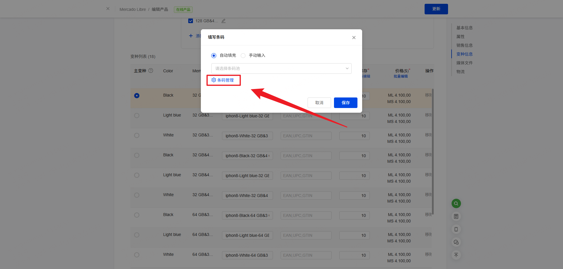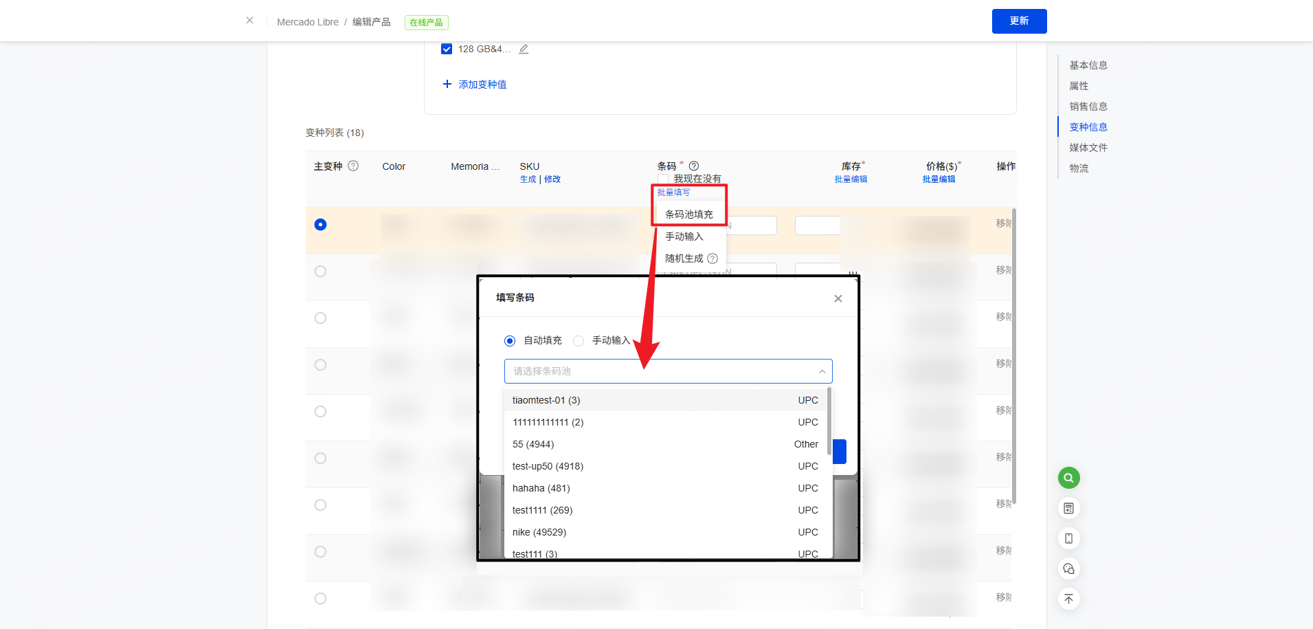 注意:被选择条码池的条码数量必须不小于当前产品的变种产品的数量,否则无法选择此条码池