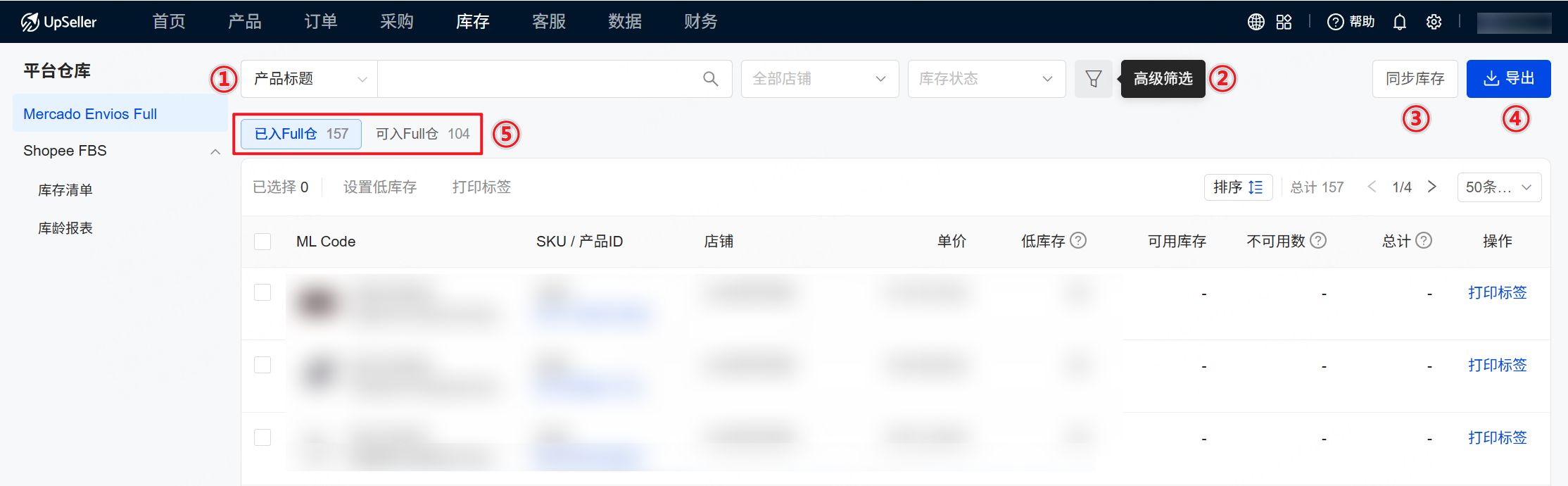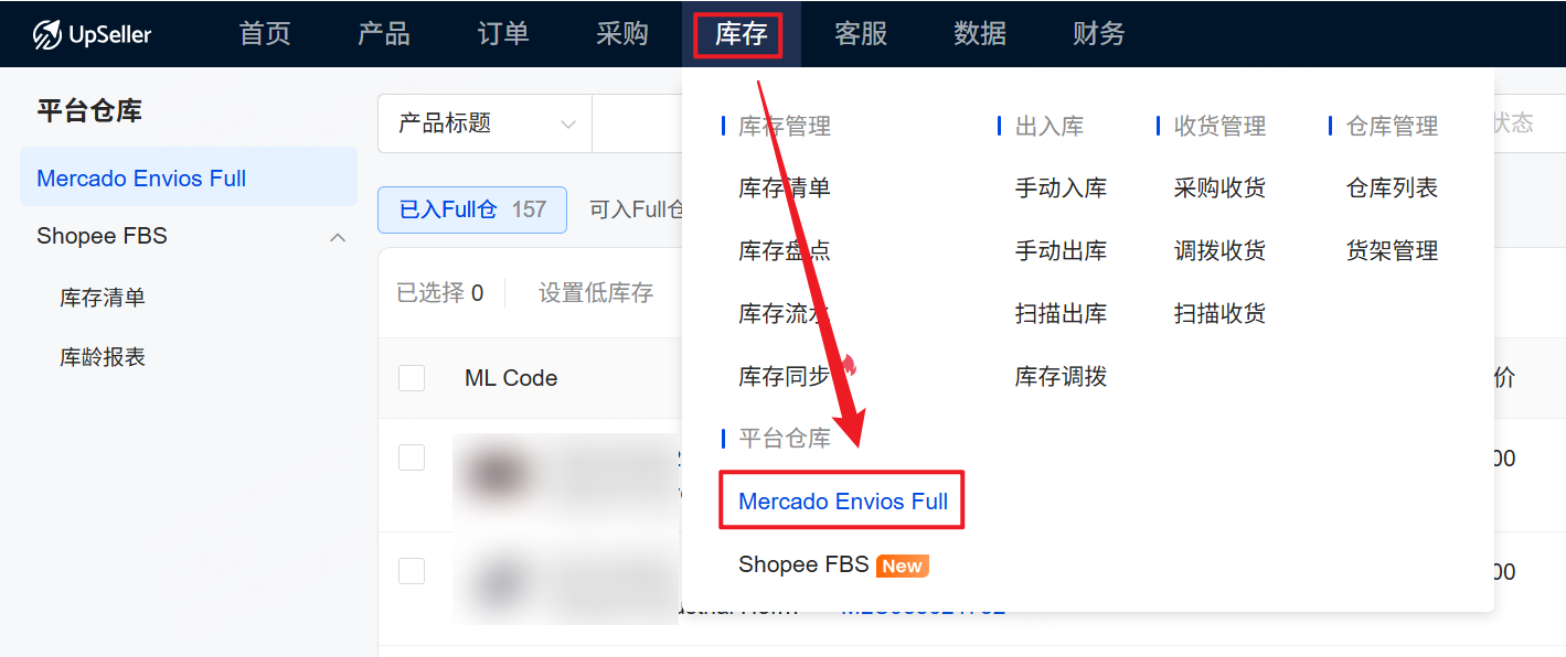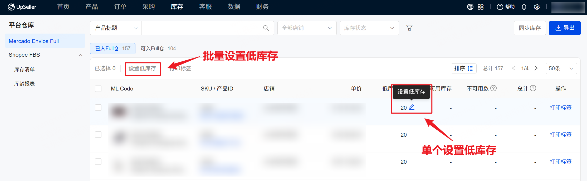 注意:跳转至Mercado Full仓库管理页面时,此时系统已自动筛选库存状态为低库存/缺货