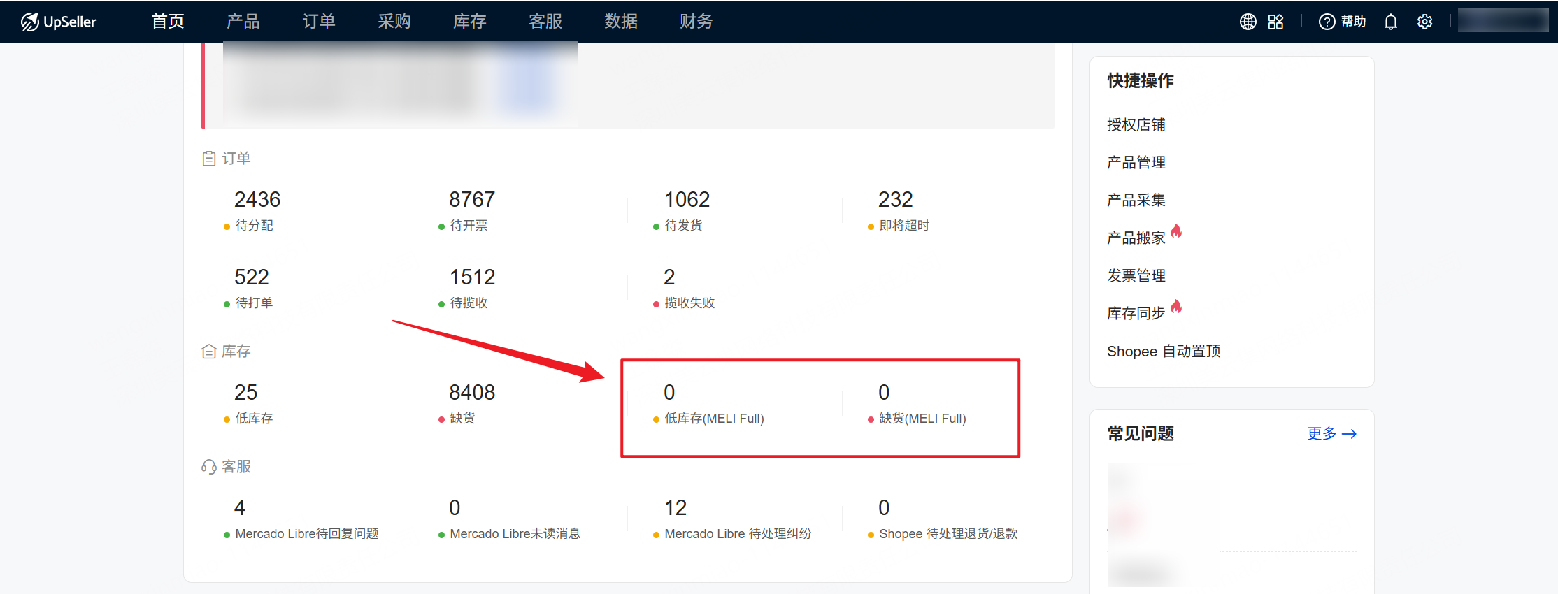 首页待办事项中会展示Mercado Full低库存/缺货产品数,点击后可跳转Mercado Full仓库管理页面